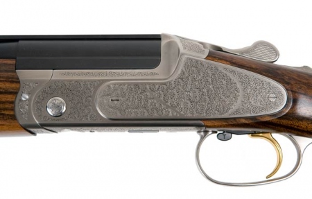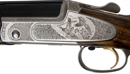 Modelo especial, de platinas acompanhadas, com a bascula em aço, finamente gravada com duas opções: gravado Inglês e gravado com cenas de caça com faizão e patos. Madeiras de nogueira seleccionada grau 7.